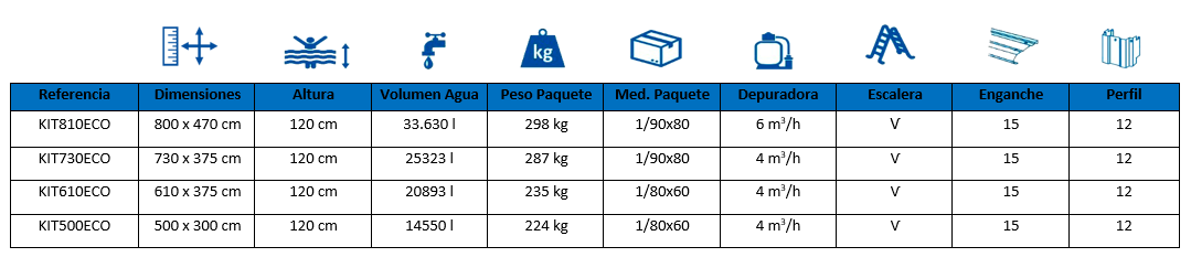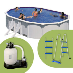 El modelo Fidji ovalado con contrafuertes laterales, cuenta con una lamina de acero perimetral (estructura) que hace de contención del peso del agua (junto con los contrafuertes metálicos) de color completamente blanco. Estos refuerzos (3 en cada lateral) vienen a formar ángulos a 90 grados que hacen de contención y refuerzo para el posterior ensamblaje a la estructura metálica. Dispone en el kit piscina de un sistema de filtración por depuradora de arena y kit de tuberías para la conexión de la misma a la piscina (skimmer y toma de impulsión) así como del sistema de tuberías flexibles a acoplar con la bomba y filtro de arena.