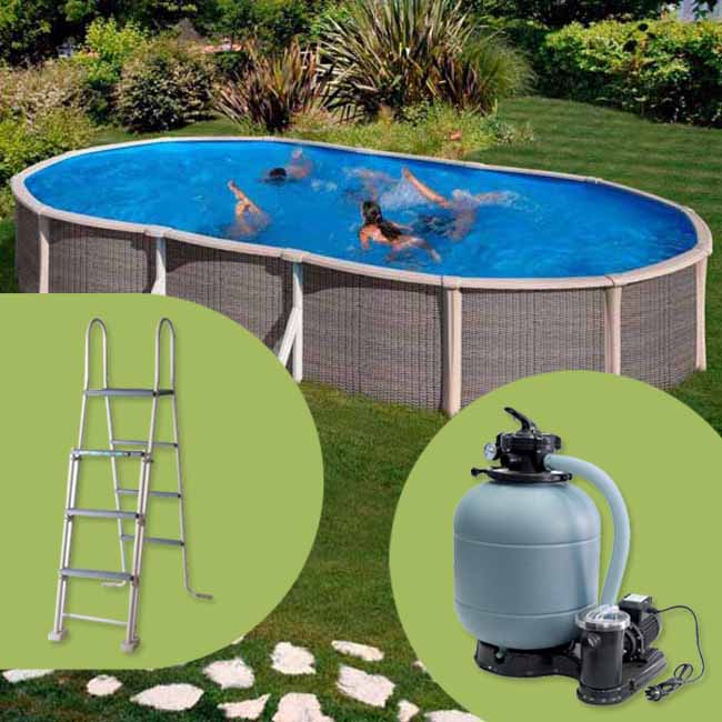 El modelo ovalado de imitación Ratán de Fusion Pool incorpora una escalera de 3 x 3 peldaños de PVC reforzado de seguridad con una plataforma superior (impide el acceso a los menores dando la opción de retirar los peldaños de la parte exterior de la piscina). Este modelo también dispone de un sistema de depuración completo por filtro de arena (6m3/h y 8m3/h) y bomba auto cebante de filtración. incluye las mangueras, adaptadores de conexión y carga filtrante de arena de silicio.