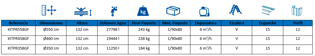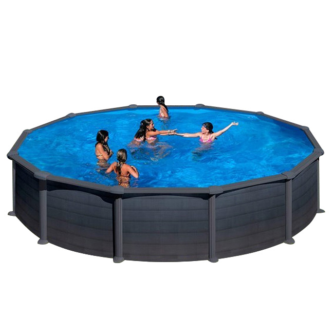 La piscina Granada circular pertenece a la gama de piscinas de acero elevadas con imitación grafito de GRE. Este modelo de piscina es ideal para su uso y disfrute con toda la familia y especialmente indicado para los más pequeños. El modelo Granada circular viene en 3 medidas diferentes y se adapta muy bien a cualquier entorno. De altas prestaciones y calidades, la piscina Granada ofrece sobretodo seguridad para los usuarios. Cuenta con una estructura de acero perimetral con imitación grafito (color gris antracita) que hace de contención del agua. Incluye además un revestimiento liner de PVC de 40/100 de color gris. Incluye refuerzos verticales y perfilería de acero con imitación grafito que hacen de unión y ensamblaje de la estructura. En su parte superior (voladizo) dispone de protectores de inyección. El kit piscina Granada circular incorpora todos los elementos para su funcionamiento ( Depuradora con filtro de arena, escalera de seguridad, tapiz de suelo, carga filtrante…).