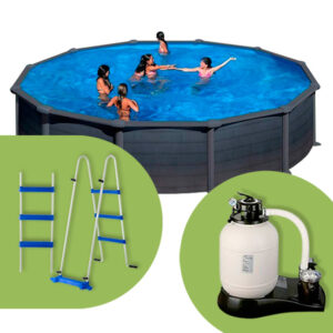 La piscina Granada circular de GRE con efecto grafito incorpora una escalera de seguridad de 3 x 3 peldaños con plataforma superior (impide el acceso a los menores dando la opción de retirar los peldaños de la parte exterior de la piscina) y filtro de arena de 4m3/h con bomba y carga filtrante (arena de silicio).
