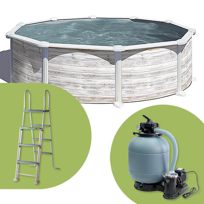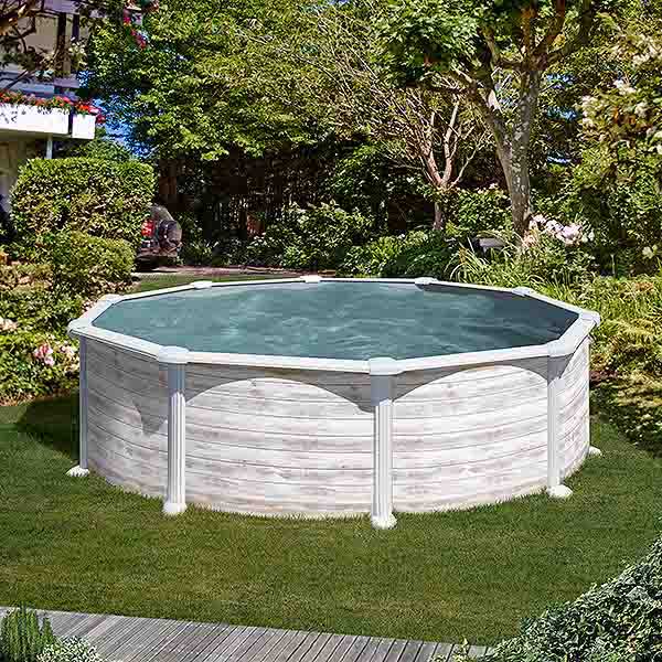 La piscina Groenlandia circular pertenece a la gama de piscinas con estructura de acero de la marca GRE. Destaca especialmente por tener una altura uniforme de 1,32 metros y un filtro de arena de gran tamaño de 6m3/h con una bomba de filtración potente para depurar el agua de forma rápida y efectiva. La Groenlandia circular incluye en esta serie 3 posibles tamaños ( 3,50 metros de Ø / 4,60 metros de Ø / 5,50 metros de Ø ). Es una piscina de acero de altas calidades con un acabado de imitación de madera blanca envejecida.