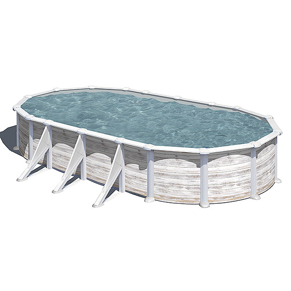 La piscina Groenlandia Ovalada se clasifica en la sección de piscinas de acero con imitación de madera blanca envejecida. Está disponible en 3 posibles medidas ( 5,00 metros de largo x 3,00 metros de ancho x 1,32 metros de altura – 6,10 metros de largo x 3,75 metros de ancho x 1,32 metros de altura – 7,30 metros de largo x 3,75 metros de ancho x 1,32 metros de altura). Tiene de serie los refuerzos laterales para sujetar y contener la estructura de la piscina. Ofrece las mejores calidades del mercado y se adapta muy bien a cualquier espacio exterior sin requerir de una losa de hormigón para su instalación.