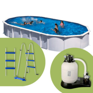 La piscina Haití ovalada de acero, incorpora un revestimiento de PVC Liner azul de 40/100 así como de skimmer completo de pared, filtración completa por filtro de arena (6m3/h, 8m3/h y 10m3/h) y bomba autocebante de GRE (0,33hP, 0,50hP, 0,75hP) con carga filtrante de arena de silicio incluida y tuberías flexibles de conexión. Como en todas las gamas de piscinas elevadas de GRE, el modelo Haití dispone de protectores de inyección en todas sus uniones y ángulos así como de perfilería de acero. También incluye una escalera de PVC reforzada de seguridad contra el ahogamiento de menores y de un fieltro (tapiz de suelo) geotextil anti bacteriano de polietileno.