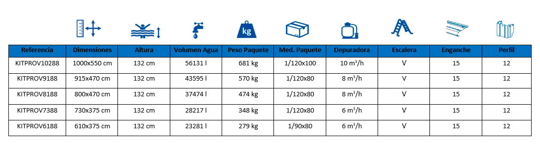 Este modelo cuenta con una pared metálica (lámina de contención) lacada en blanco. Incluye skimmer de pared completo e impulsor de rechace así como de un grupo de filtración compacto (filtro de arena, bomba y carga filtrante de arena de silicio). También intengra en el Kit piscina de una escalera de PVC reforzada de PVC con plataforma superior.