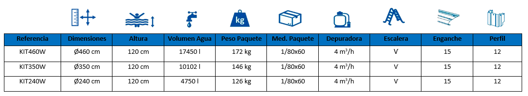 El modelo Pacific circular de acero, incorpora un revestimiento interior Liner de PVC azul de 30/100 o 40/100 (dependiendo de las medidas) así como de skimmer cuadrado de pared, depuradora completa por filtro de arena (4m3/h) y bomba autocebante de GRE (0,33hP) con carga filtrante de arena de silicio incluida y tuberías flexibles de conexión. Dispone de una escalera de seguridad con plataforma superior y un sistema contra el ahogamiento de menores (peldaños desmontables).