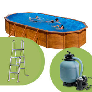 La piscina de chapa Pacific ovalada cuenta con una estructura/pared (lámina de contención y perfiles de acero de unión) con imitación de madera. Dispone a su vez de un skimmer de pared completo e impulsor con rechace así como de un grupo de filtración compacto (filtro de arena + bomba + tuberías flexibles + carga filtrante de arena de silicio). También intengra en el Kit piscina una escalera de seguridad con plataforma superior.
