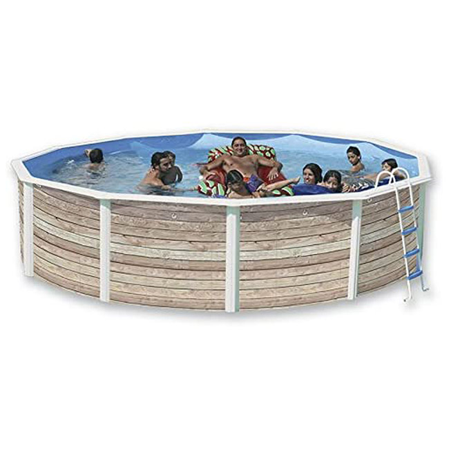 La piscina Pinus circular pertenece a la gama de piscinas de acero elevadas de imitación madera de la marca TOI. El kit incluye todos los elementos necesarios de la piscina (estructura de acero, escalera de acceso de 8 peldaños, liner de PVC con tratamiento anti-UV de color azul, depuradora de arena con tuberías, skimer, impulsor y carga filtrante). La piscina Pinus circular está ideada para su colocación en cualquier tipo y tamaño de jardín ya que incluye en esta serie 4 tamaños diferentes (3,50m / 4,60m / 5,50m / 6,40m con una altura estandart de 1,20m).