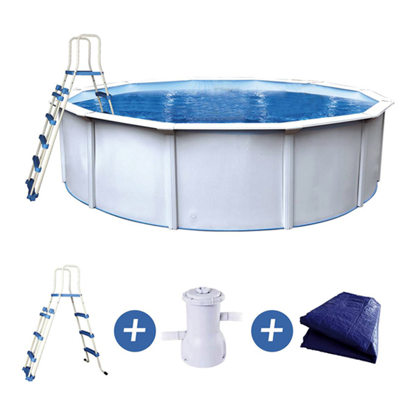 Sistema: Se trata de una lamina de acero de una sola pieza, esta compone la pared y estructura contenedora del agua. Se inserta esta lamina de acero en un raile inferior para asegurar que la base de la piscina no se pueda mover. El revestimiento de estanqueidad (liner) termo soldado de fabrica asegura la impermeabilización y retención del agua en el vaso de la piscina. Dispone de un sistema de depuración por filtro de cartucho (3,7L/h) con tuberías flexibles de conexión además de un skimmer (cajón de absorción) y una válvula de impulsión (rechace del agua ya filtrada a la piscina).