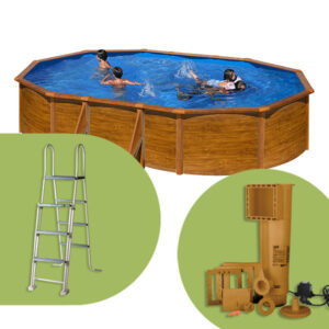 La piscina de elevada de acero Sicilia ovalada cuenta con una pared (lámina de contención y perfiles de acero de unión) de imitación de madera. Incluye también un skimmer de pared completo e impulsor de rechace integrados en un filtro de cartucho adherido a la estructura. Este tipo de sistema de filtración (filtro integrado a la estructura) es ideal tanto para el ahorro y optimización del espacio exterior así como por su practicidad para evitar posibles fugas de agua del circuito de tuberías de la depuradora. También se incluye en el Kit piscina una escalera de seguridad con plataforma superior para un acceso más cómodo y seguro.
