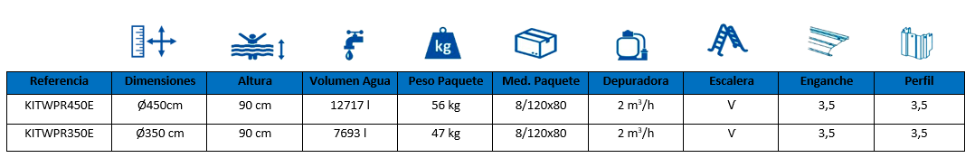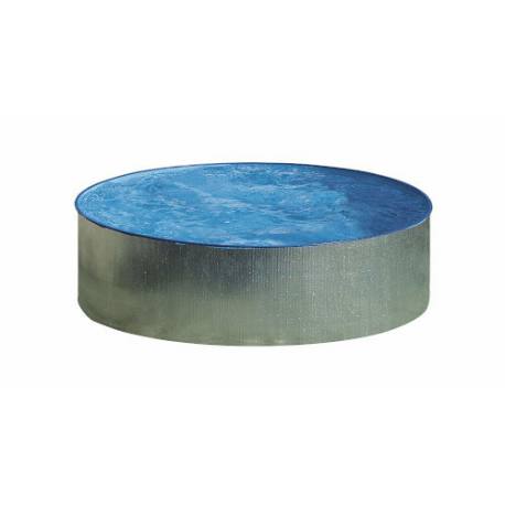 Este modelo de piscina, cuenta con una lamina de acero (pared) en bruto, con enganche perimetral superior tipo HUNG para el liner de PVC, que hace de contención del peso del agua e impermeabilización del vaso de la piscina. Es una lámina única que no requiere de contrafuertes. Dispone en el kit piscina de escalera de PVC de 2×2 peldaños y de un sistema de filtración por filtro flotante (skimmer flotante) sujetado a la pared de la piscina (especialmente ventajoso para la optimización del espacio disponible).