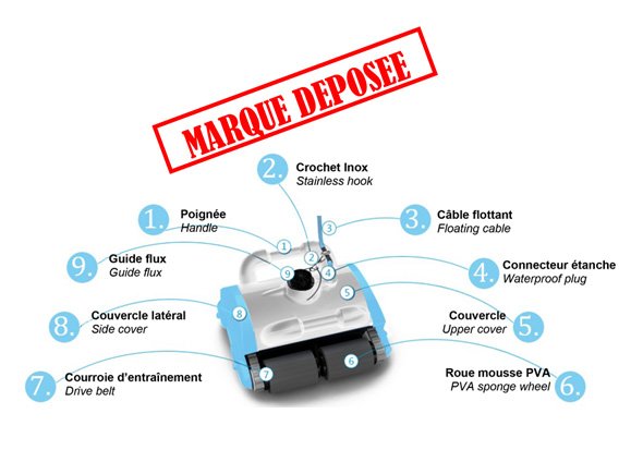 • 2 motores de tracción: permitiendo un desplazamiento cualquiera que sea la forma o fondo de la piscina