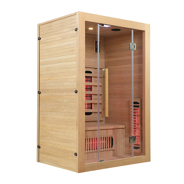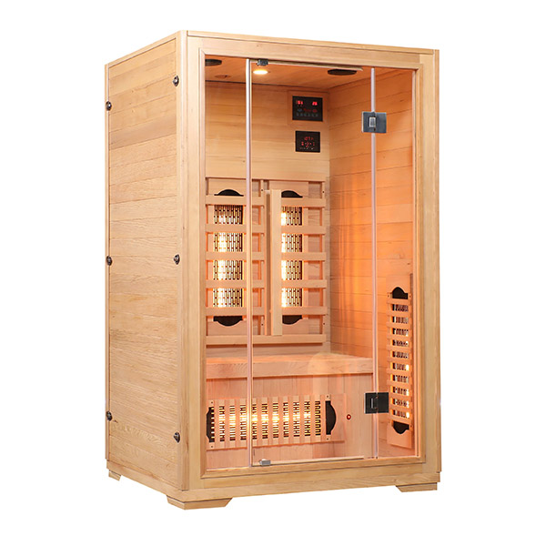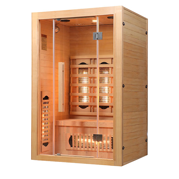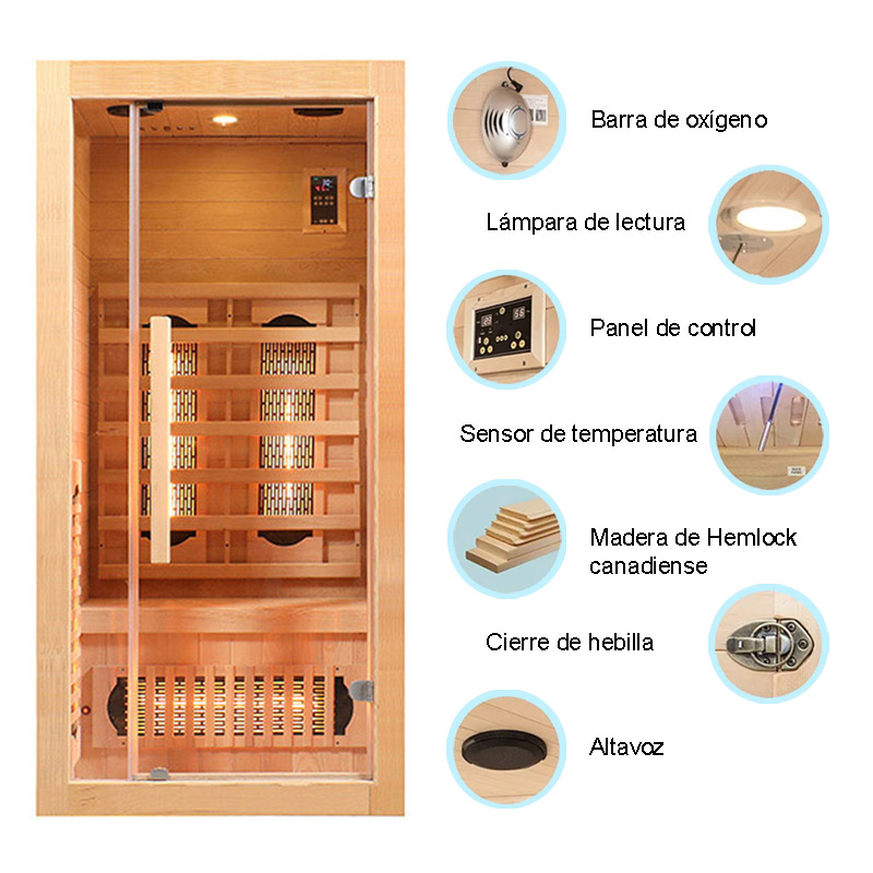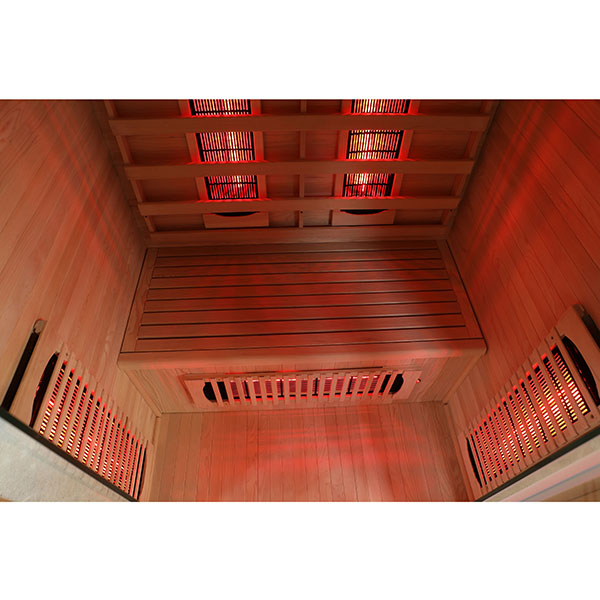 Sauna de infrarrojos de altas prestaciones gracias a sus emisores de espectro completo y quarzo que permiten un inicio de sesión rápido y sin necesidad de precalentamiento/sistema de calentamiento inmediato por halógenos de alta intensidad ( a diferencia de las saunas con emisores de carbono o cerámica ).