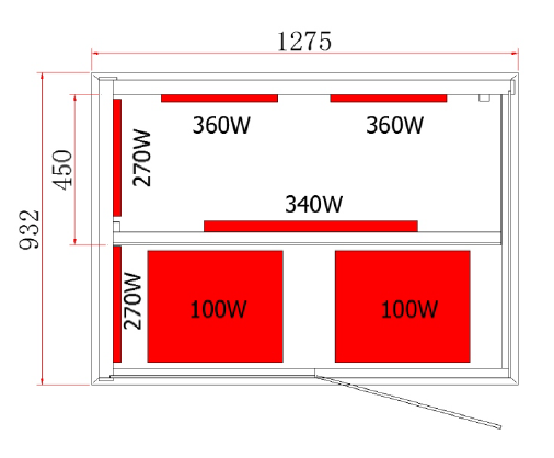 • Capacidad total 1800 vatios. Parte posterior 2 x 360 vatios (700 vatios), lateral 2 x 270 vatios, pantorrillas 1 x 340 vatios, piso 2 x 100 vatios
