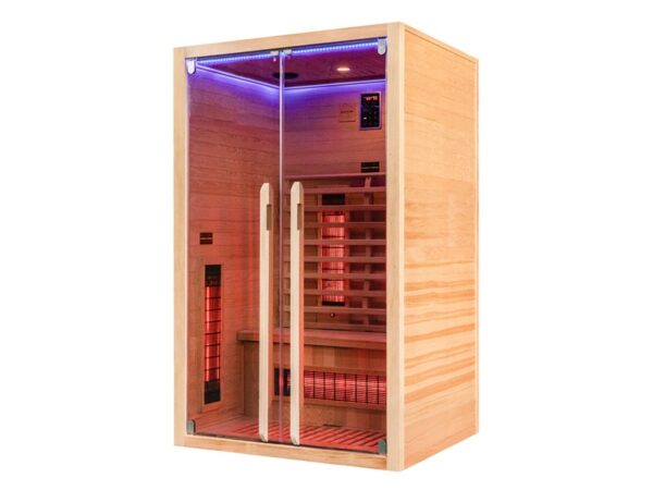 Sauna de infrarrojos Elvi de 2 plazas. Fabricada en madera de cicuta Canadiense (Canadian Hemlock) para instalarse en el baño, dormitorio o gimnasio privado.