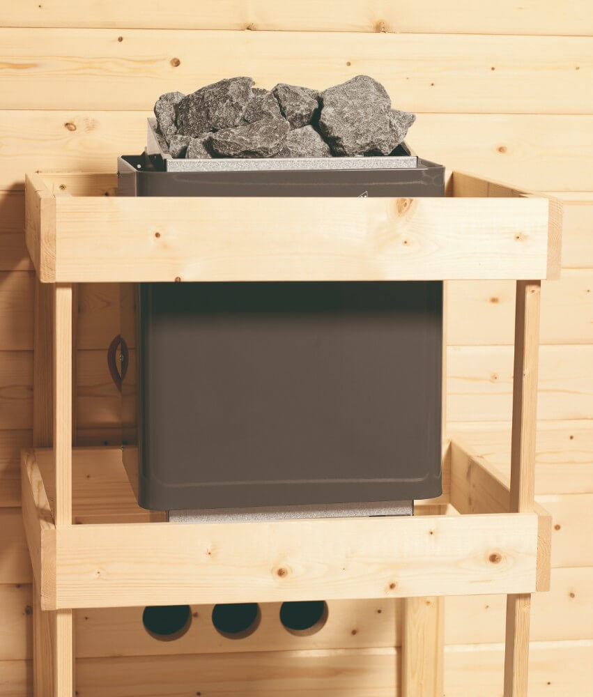 El interior esta equipado de 3 bancos (57cm), de un reposa cabeza y de un protege caldera, todo ello de madera maciza.