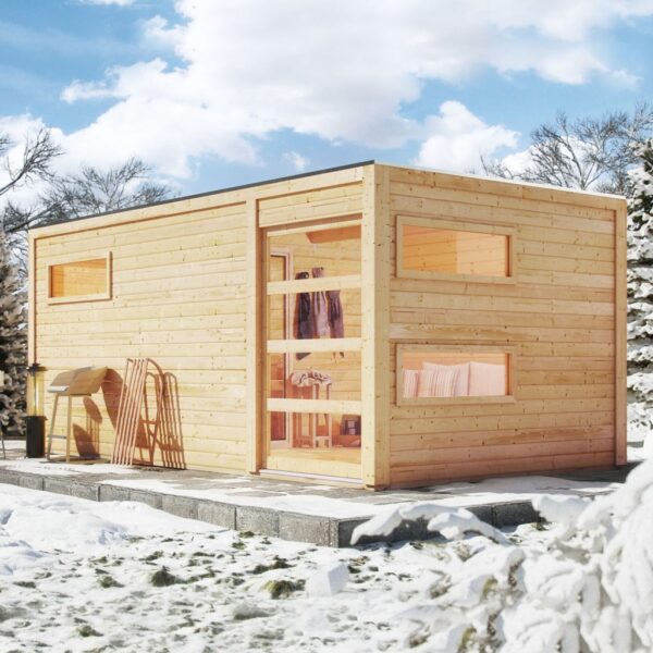 La nueva sauna hYGGE con techo plano es una verdadera joya! El techo plano moderno se completa con una elegante franja de cubierta de aluminio , a través de la puerta corredera puede entrar a un comodo vestíbulo. Las 3 ventanas de vidrio reales se pueden colocar individualmente.
