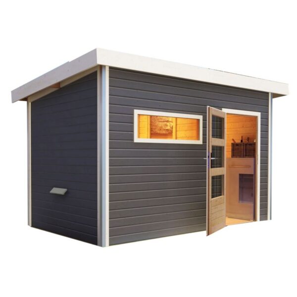esta sauna exterior Finlandesa es una sauna de madera maciza de 38mm de grosor fabricada al 100% en Alemania. Esta sauna es evolutiva en cuanto a la personalización de su equipamiento y diseño tanto en interior como en exterior.