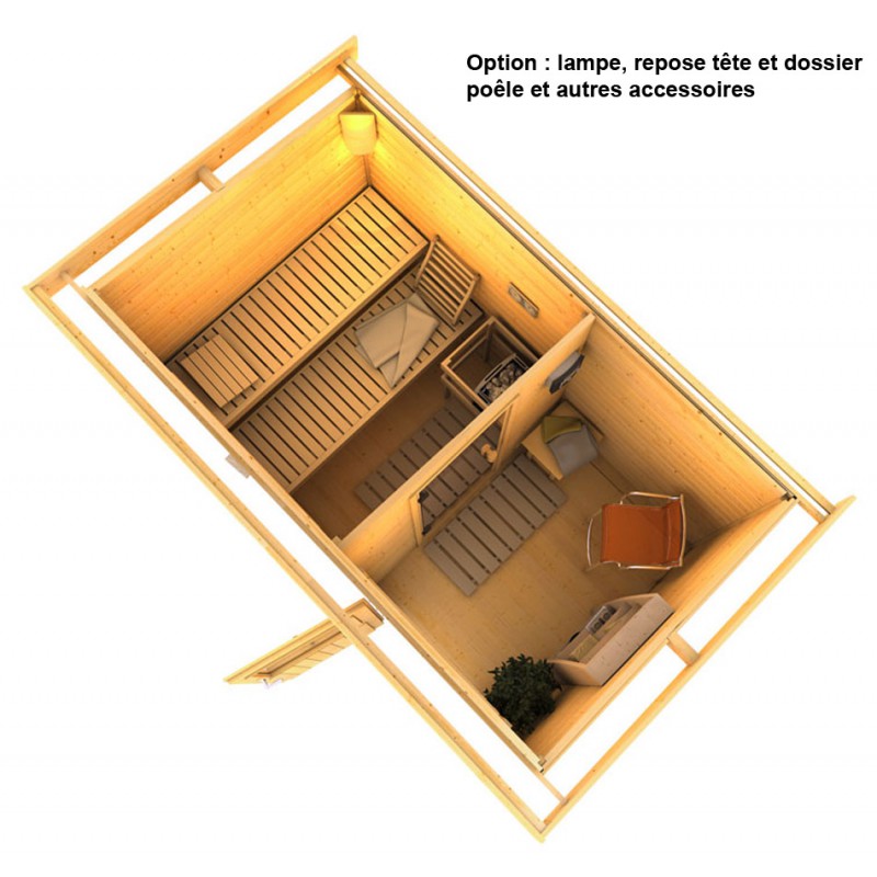 El diseño y la concepción de esta gama esta firmada por Karibu, fabricante Alemán reconocido por la calidad de sus productos. Los madreros de madera maciza de doble ranura machihembrados de 38mm aseguran un buen aislamiento y resistencia en el tiempo de la sauna.