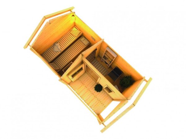 El modelo sauna Finlandesa Chalet 4 – 5/6 Plazas es uno de los mas completos y amplios. Se compone de una terraza, un amplio vestuario y una cámara térmica para poder acostumbrarse al calor intenso y salir de este sin entrar en contacto con el aire exterior directamente. Puede albergar entre 5 y 6 personas sentadas o 2 personas tumbadas.