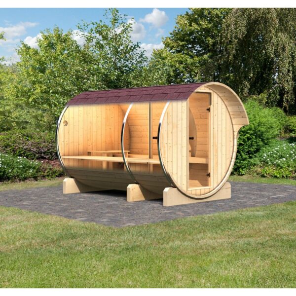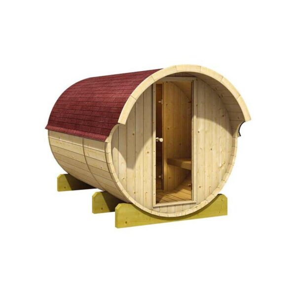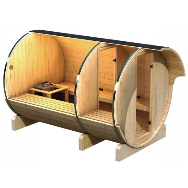 Esta sauna Finlandesa de Barril 3 Karribu con cámara térmica 4/6 plazas esta concebida en madera de epicea de 42mm en cuanto a la parte del barril y maderos macizos de 28mm para la paredes delantera y trasera. Dispone de dos cercados de estabilización para reforzar su firmeza en el tiempo.