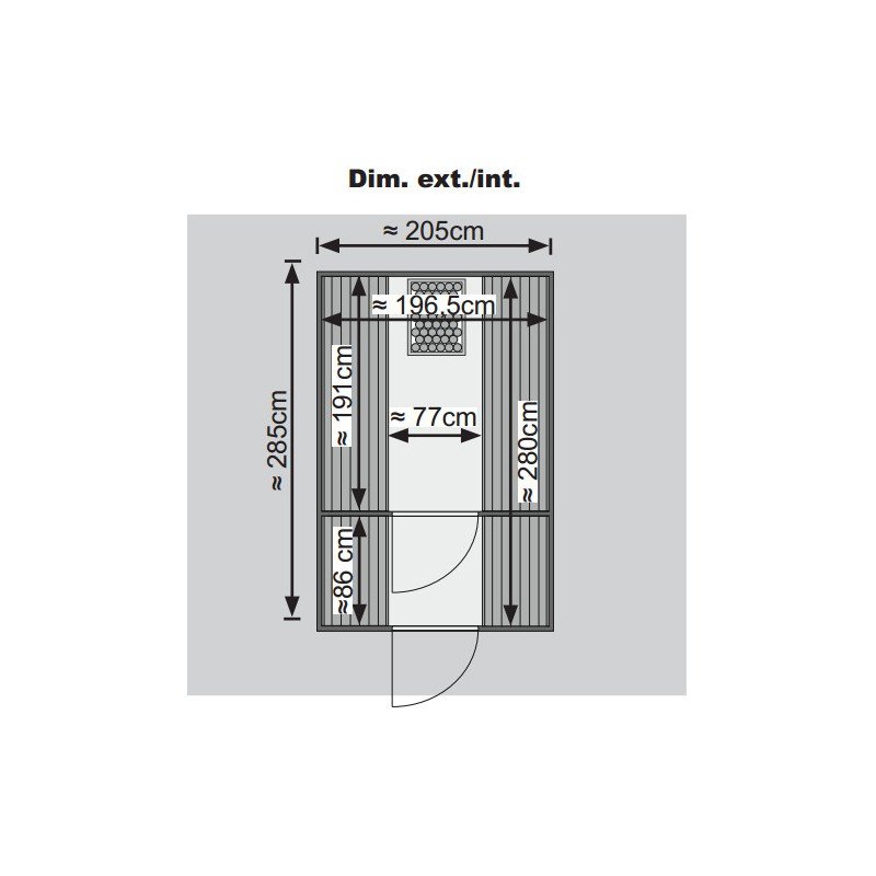 La parte principal esta equipada con 2 amplios bancos con una profundidad de 50cm para poder albergar entre 4 y 6 personas sentados o 2 tumbadas- La caldera se aísla del posible contacto con las personas por un marco de madera maciza.
