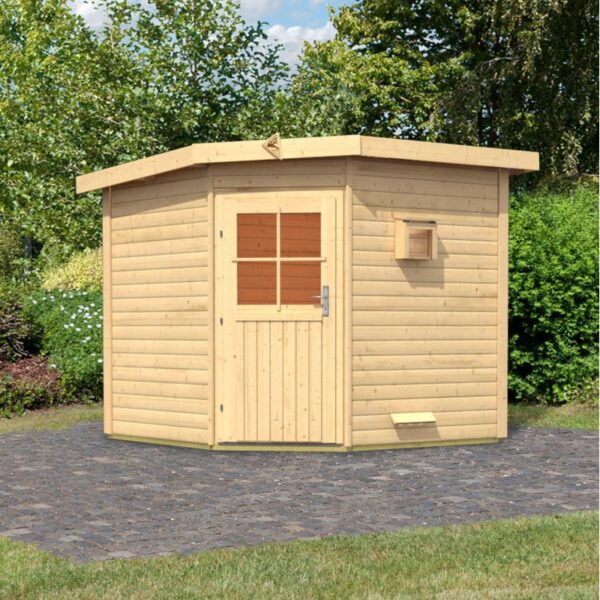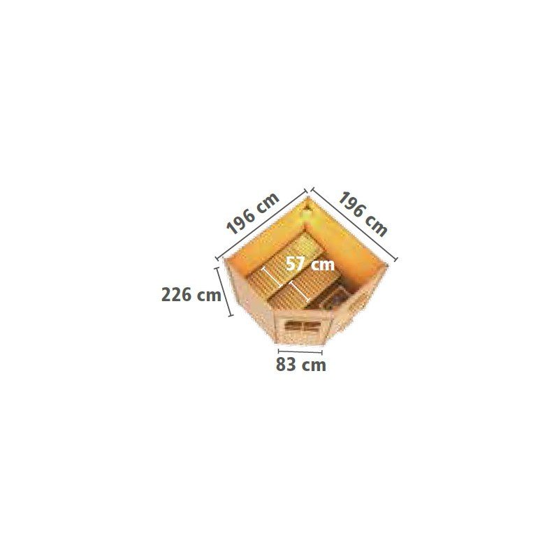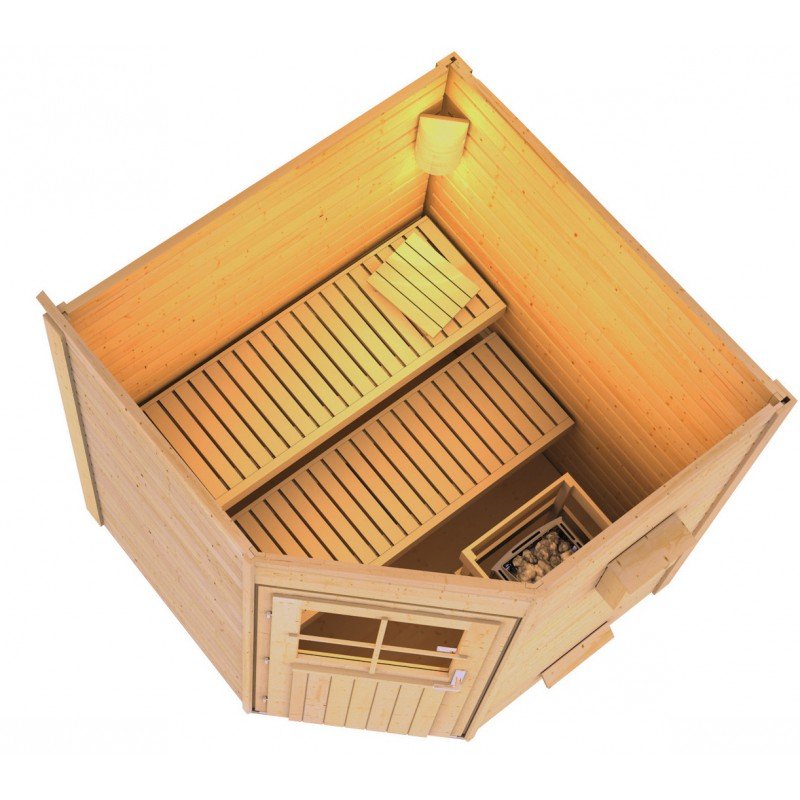 La sauna Finalandesa Pekka se entrega con dos bancos de diferentes alturas, una caja de control, una caldera, una protección de caldera, un martillo de emergencia. La puerta de madera acristalada dispone de una cerradura y de tres llaves.