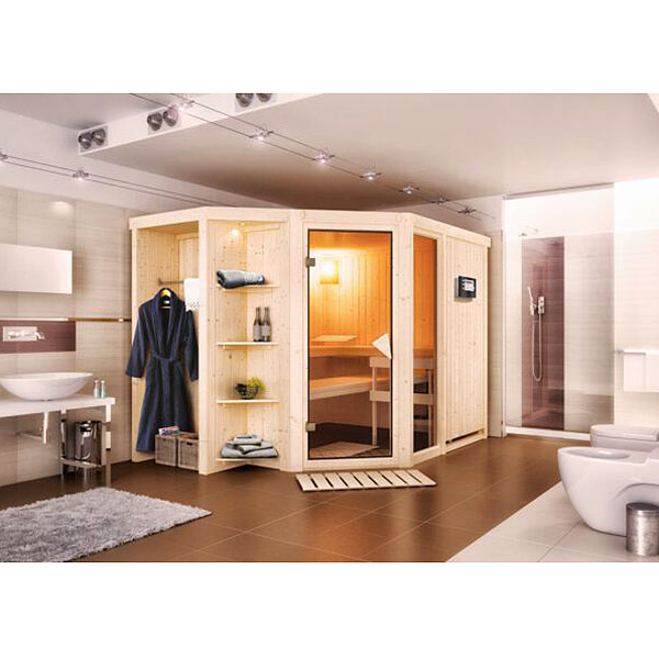 Amplia y de diseño moderno, la sauna Finlandesa Sjard Karibu Plug & Play es robusta y sencilla al uso. La sauna Finlandesa Sjard de Karibu está realizada mediante un tecnología innovadora que le permite retener el calor y consumir muy poca energía. Se trata del sistema de 68mm de Karibu incluido en los paneles prefabricados de madera maciza, con una aislamiento de lana mineral de un grosor de 42 mm y recubierta por laminas acanaladas especiales Sofline de e picea de 12,5mm. La esencia de la madera es de e picea del norte de alta calidad, lo que asegura una garantía de 5 años.