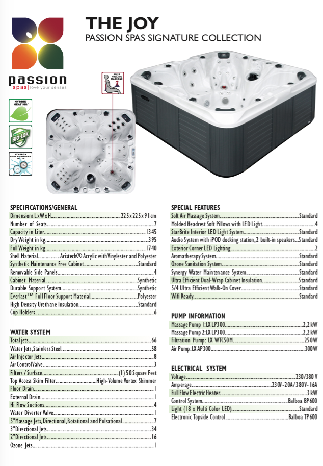 El SPA Joy se caracteriza en primer lugar por sus asientos profundos y anchos de cubo siendo estas las características de marca del spa Joy. Además Cada asiento está repleto de una configuración de chorros de masaje diferentes para ofrecer un masaje personal vigorizante. Por lo general los